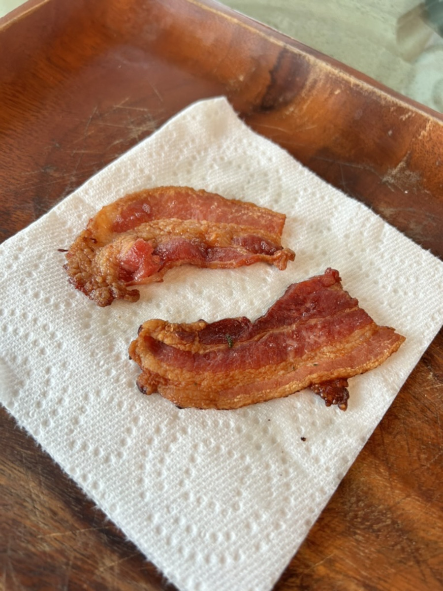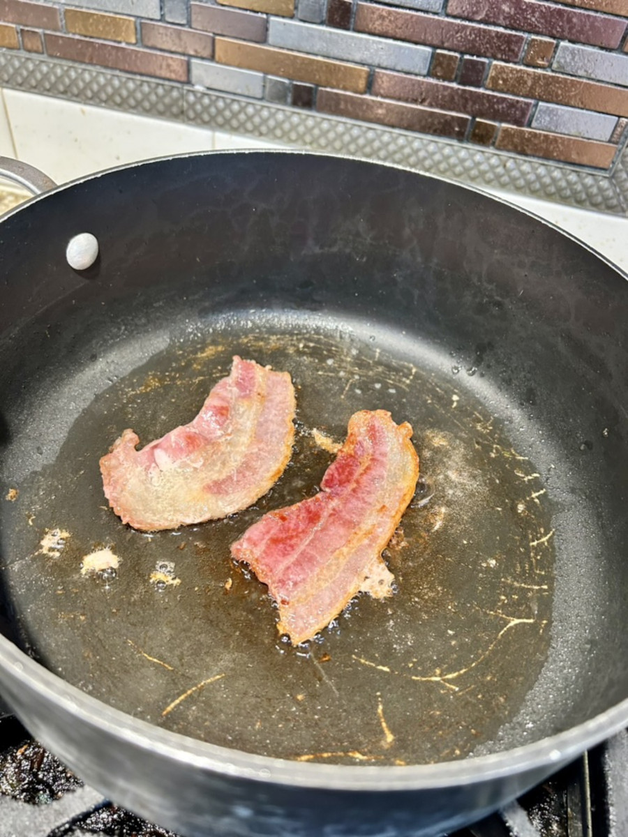 Cook bacon until the fat is fully rendered. Don't reduce the heat, but remove the bacon and place it on a paper towel to cool and drain.