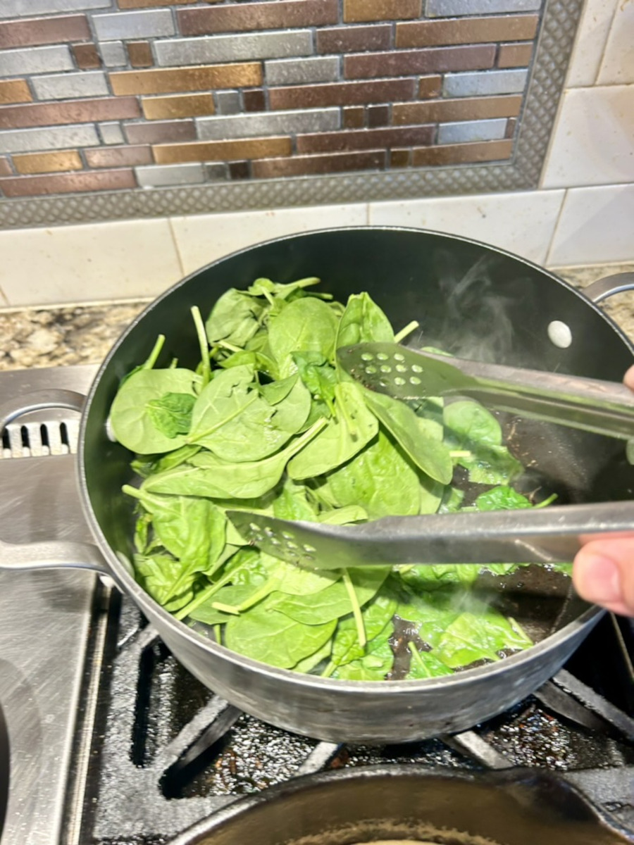Quickly toss to coat the spinach leaves in the hot oil and bacon fat. You want every leaf to briefly touch the oil and fat at the bottom of the pot.