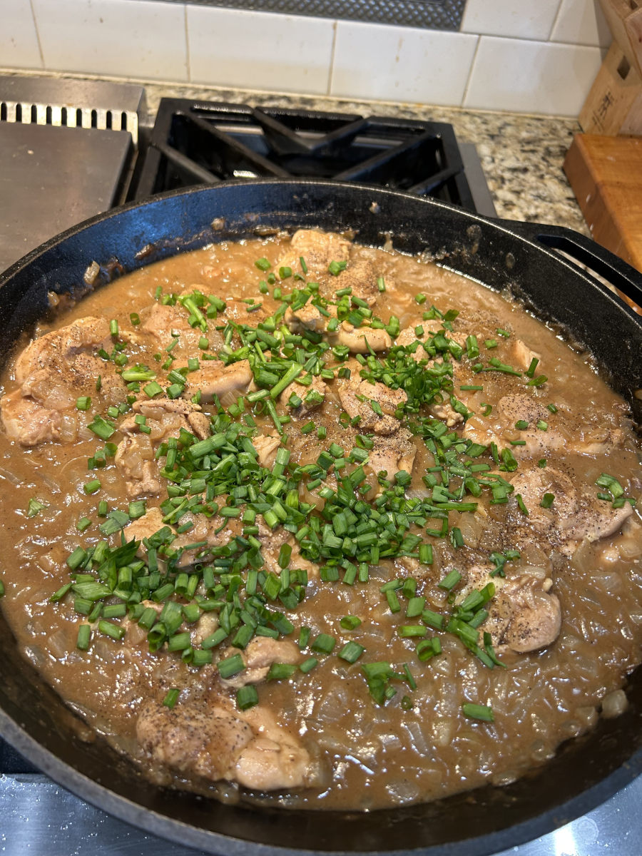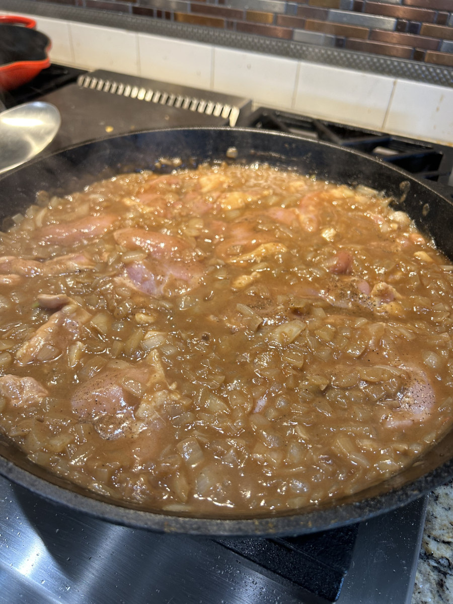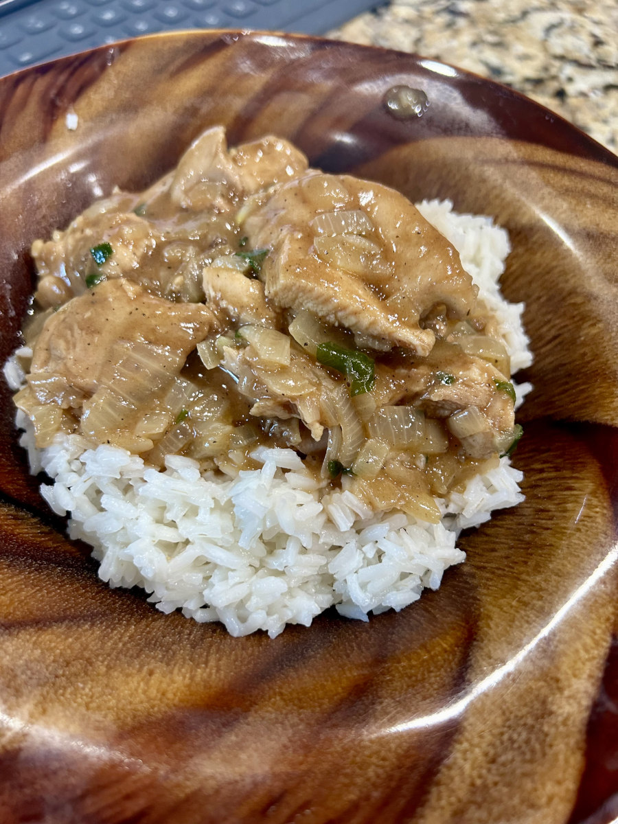 Chicken thighs smothered in rich dark roux onion gravy, served over white rice.