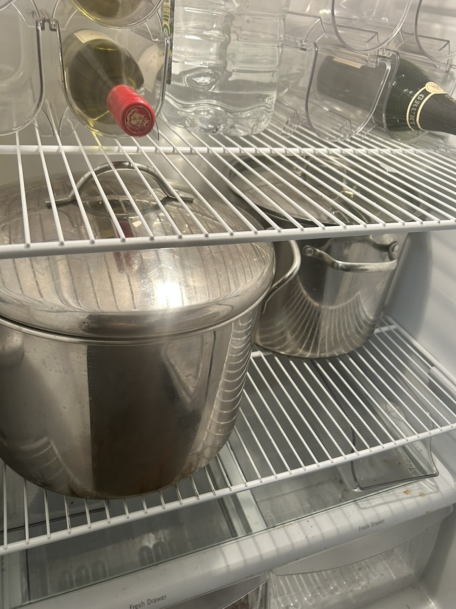 Let the brine concentrate cool until no longer steaming, then stir in the remaining 3 quarts of water. Check the temperature of the brine; it should be room temperature or lukewarm.