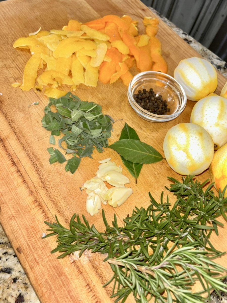 3 oranges, 3 lemons, 1/2 cup sage leaves, 2 bay leaves, 1 tbsp peppercorns, 5 cloves garlic, 2 sprigs rosemary