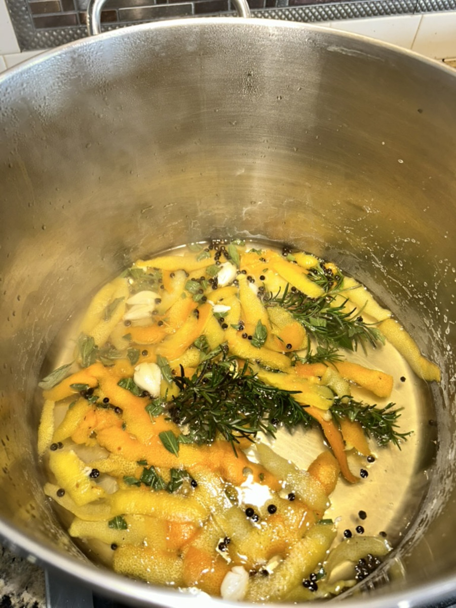 Add the orange and lemon peels, chopped sage, bay leaves, peppercorns, rosemary, and garlic. Let the water return to a boil, then remove from heat.