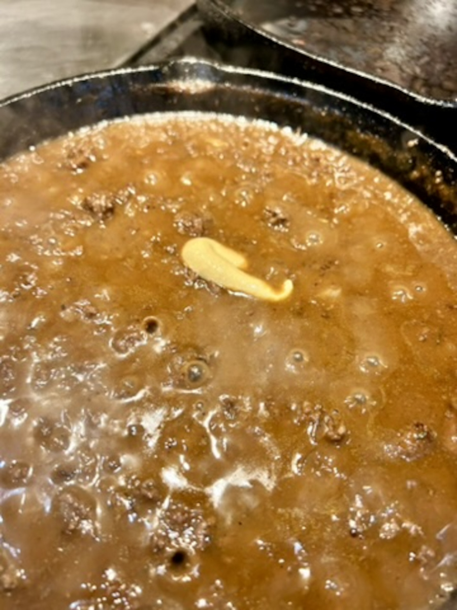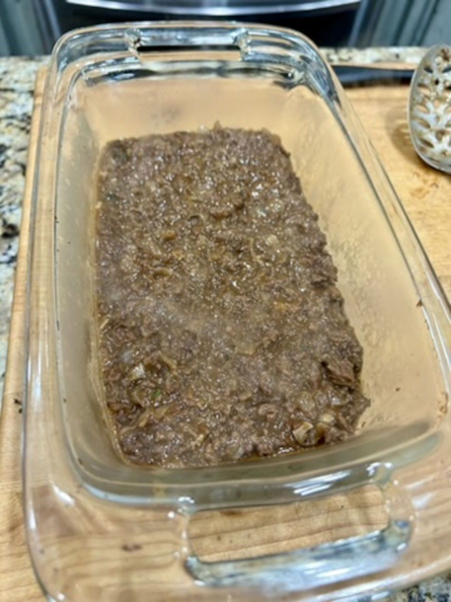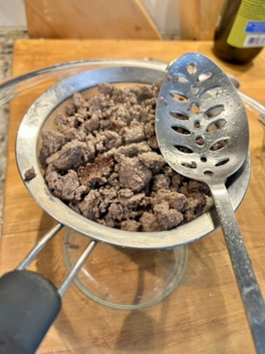 Thoroughly brown the ground beef, then remove it to a colander. Allow the ground beef to drain as much oil as possible.