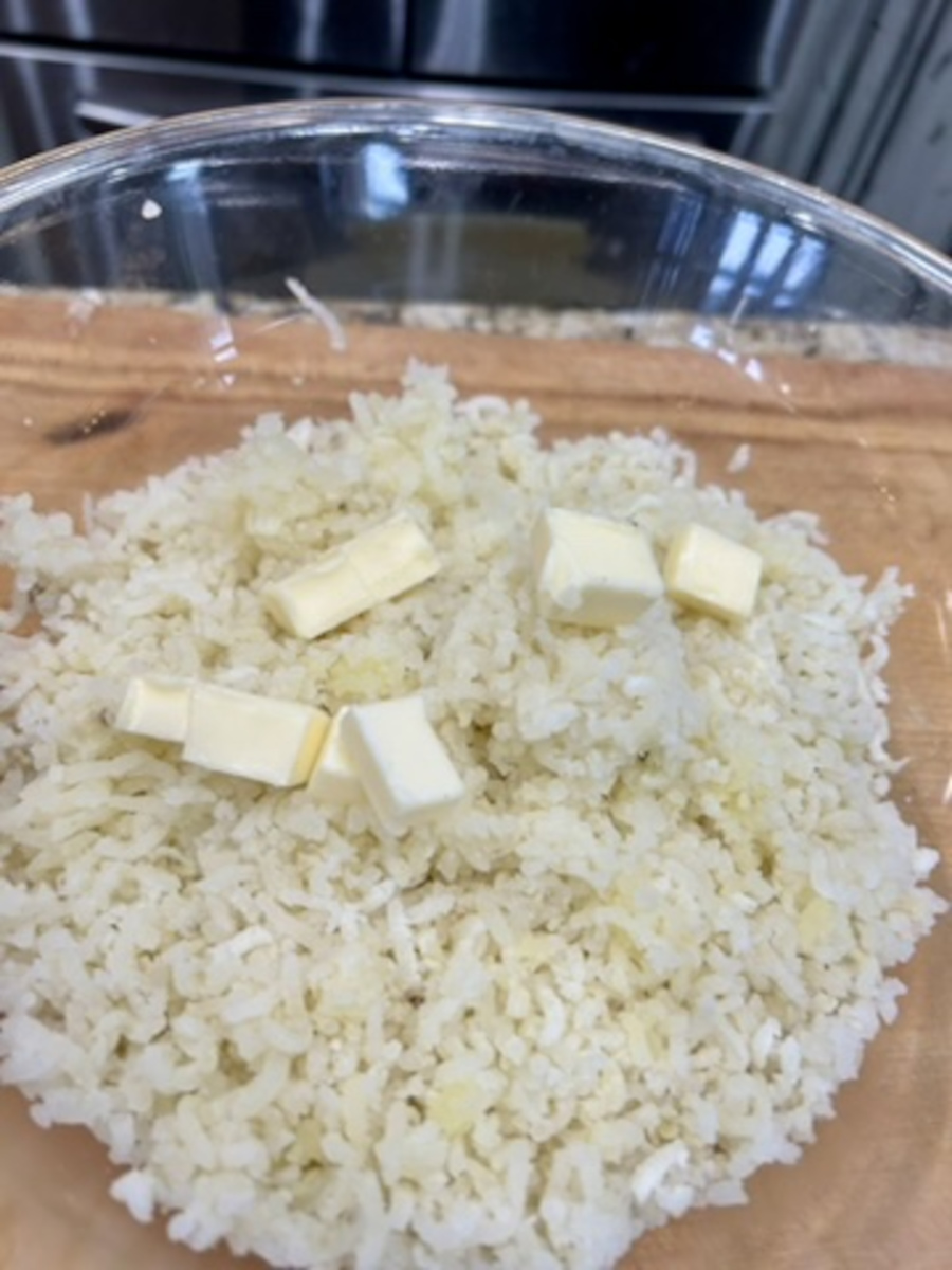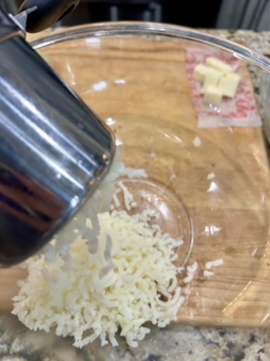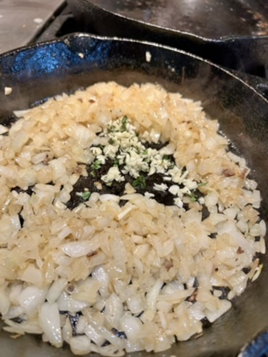 Add the onions to the pan, plus 2 tbsp of butter. Sauté until translucent. Add the garlic and thyme, and sauté until aromatic.
