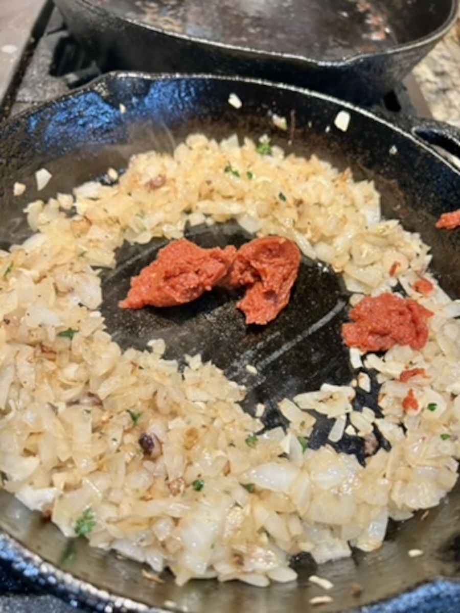 Add the tomato paste to the skillet.