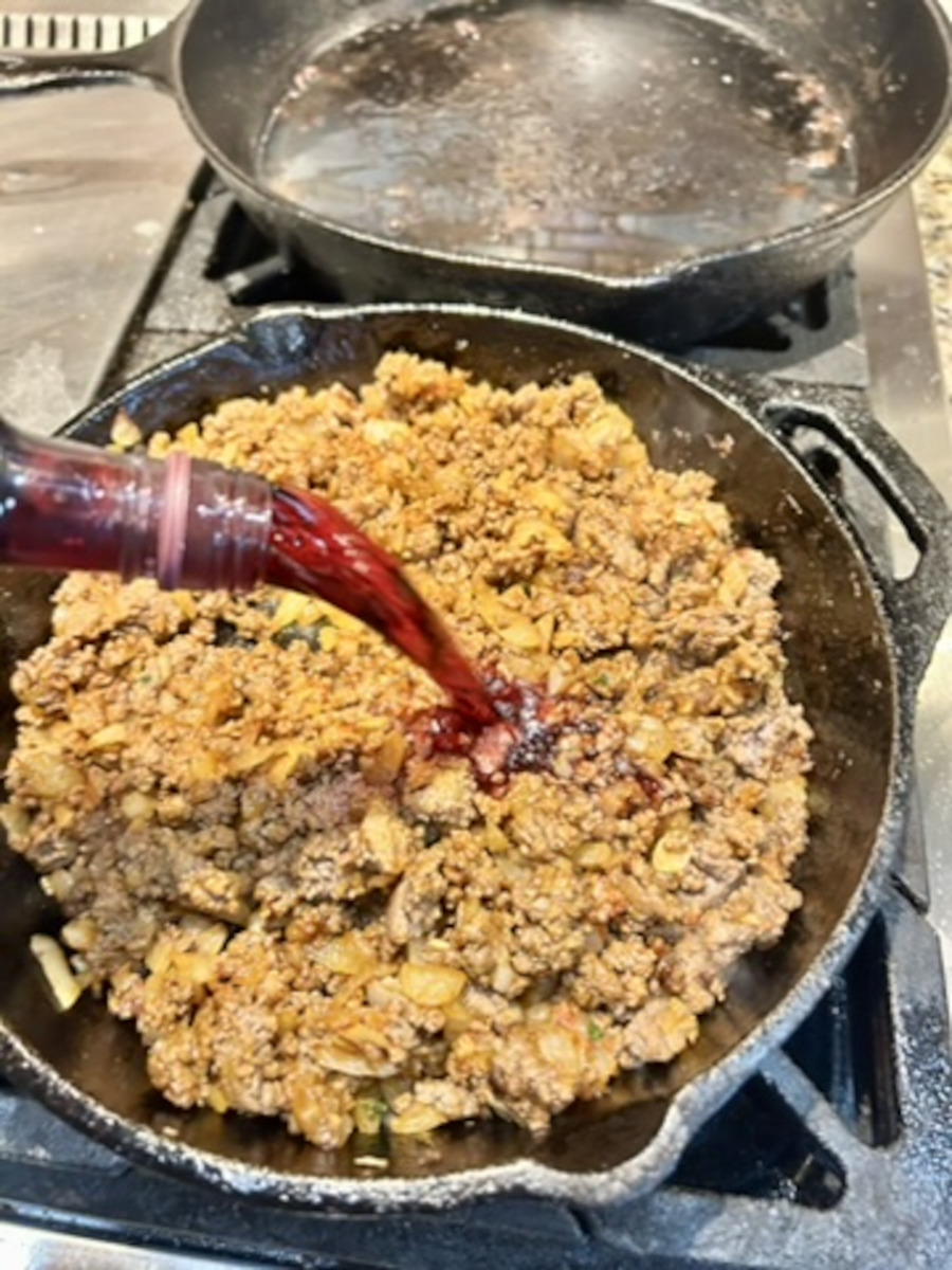 Add the red wine. Stir it all together, and scrape up any crusty bits from the bottom of the pan (the fond).
