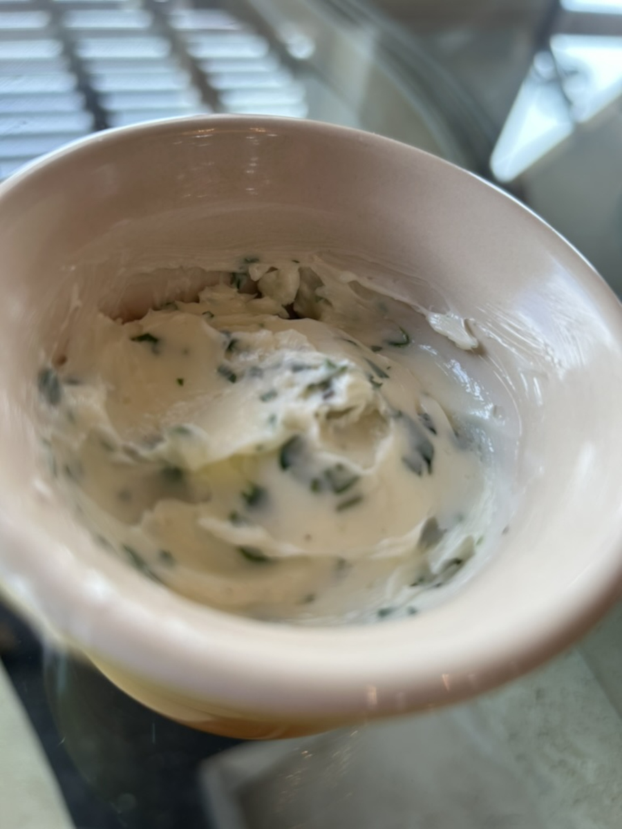 Heat up a medium skillet over medium-high heat. Add 1 tbsp Herbed Butter. When it is melted, swirl it in the pan to coat. Add the sliced ciabatta bread, open-side down. Toast in the butter until lightly browned. Remove to a tray, open side up.