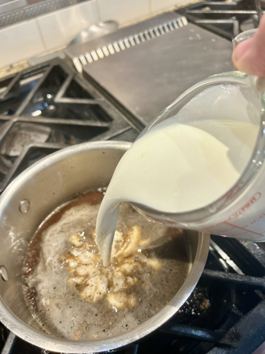 Add the stock and Worcestershire sauce. Use beef stock if serving with steak. Use chicken stock if serving with chicken or pork. Stir to incorporate.