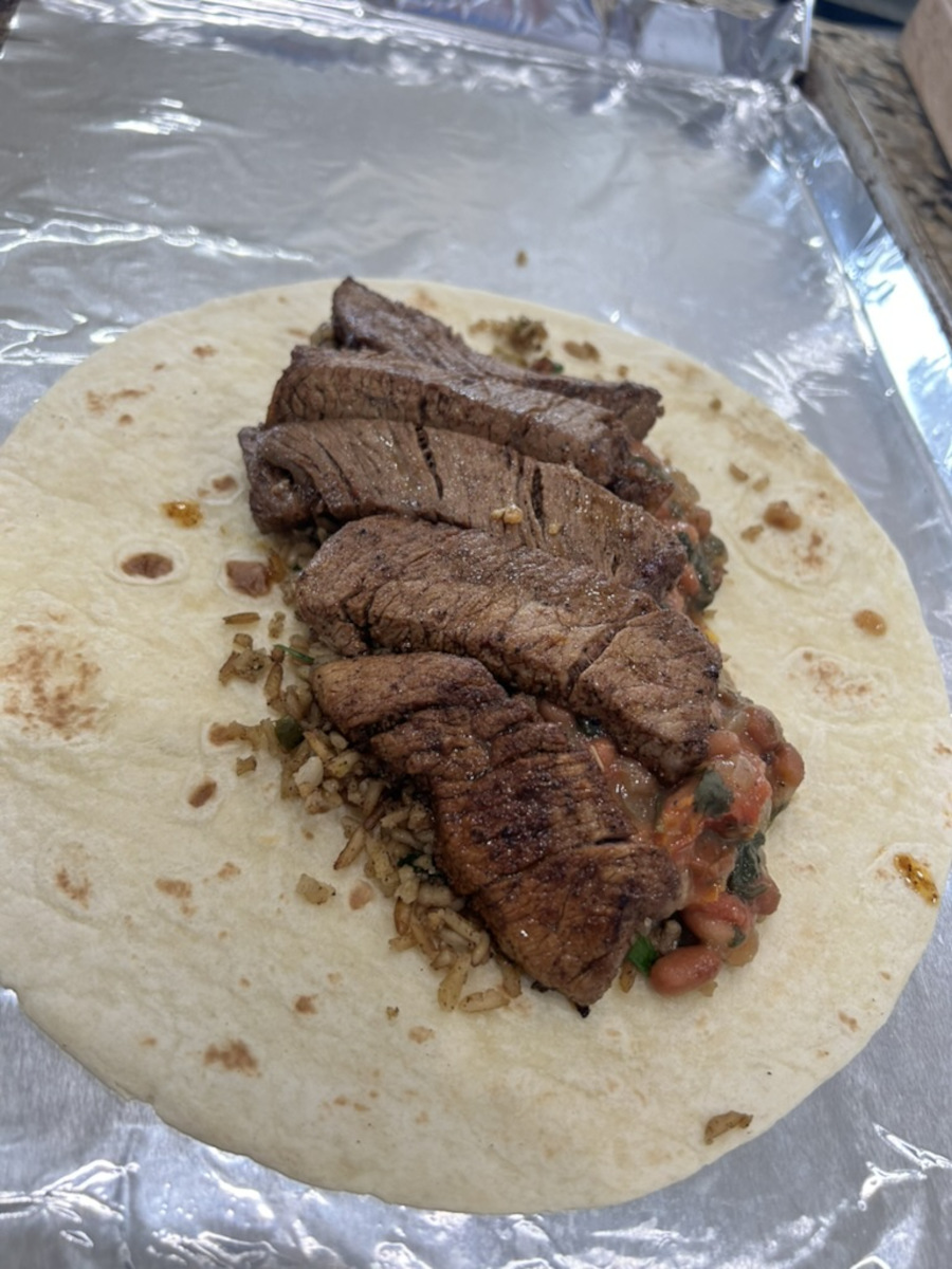Add a generous scoop of rice, beans, and meat to each tortilla. Roll up the tortilla in burrito style.