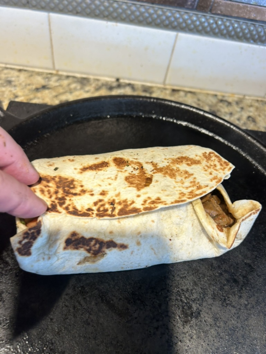 Pre-heat oven to 400℉. Using a large spatula, carefully add the burritos seam side down to a hot comal or large dry skillet. Allow the tortilla to toast slightly, then carefully turn the burrito over to toast the other side. Do this for each burrito separately.