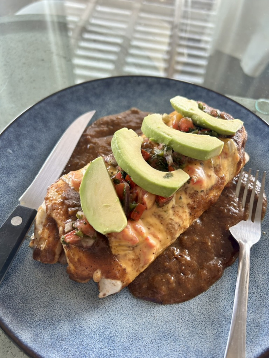 Remove from the oven, and carefully plate the burritos. Top with fresh Pico de Gallo, or avocados.