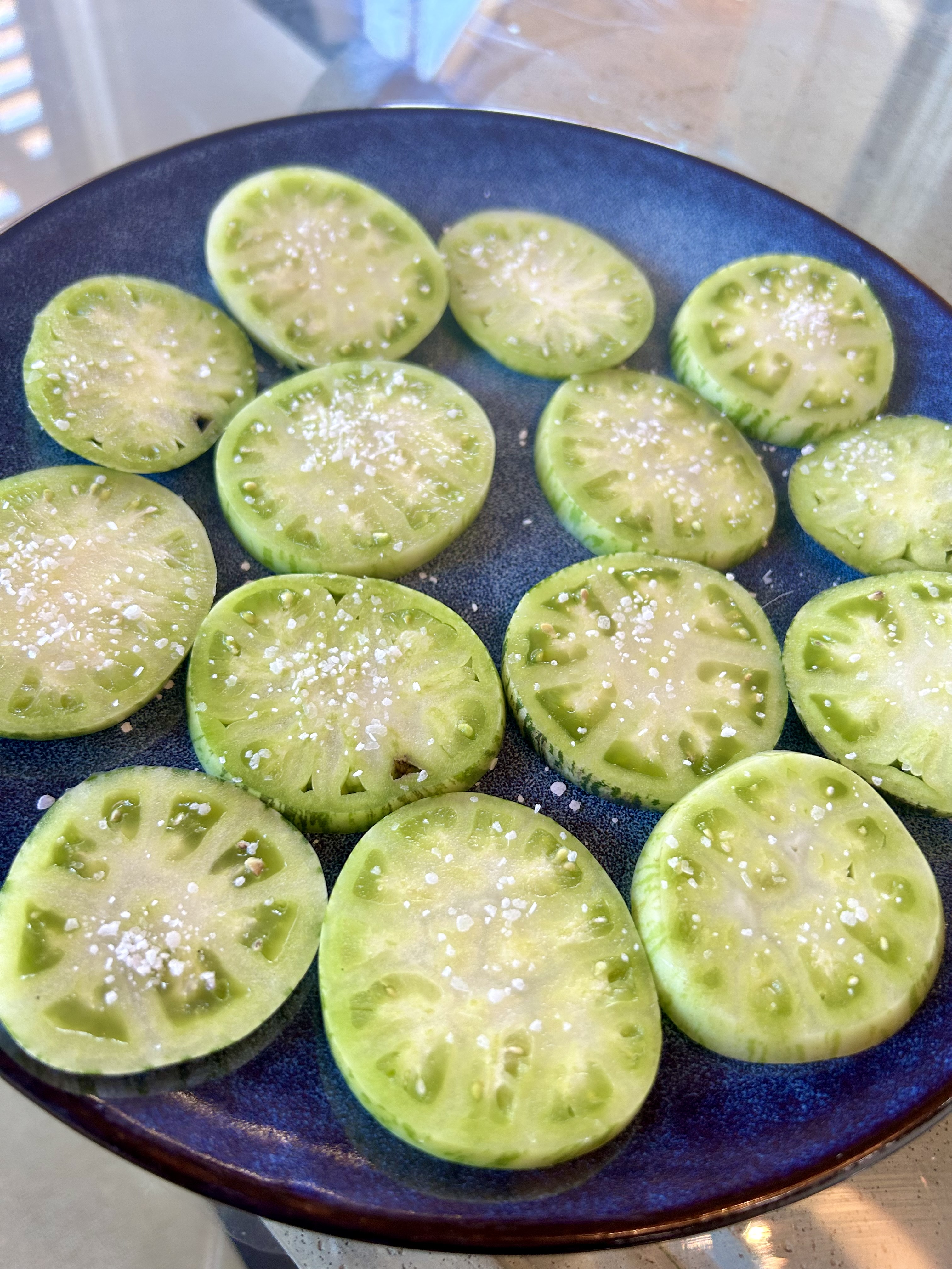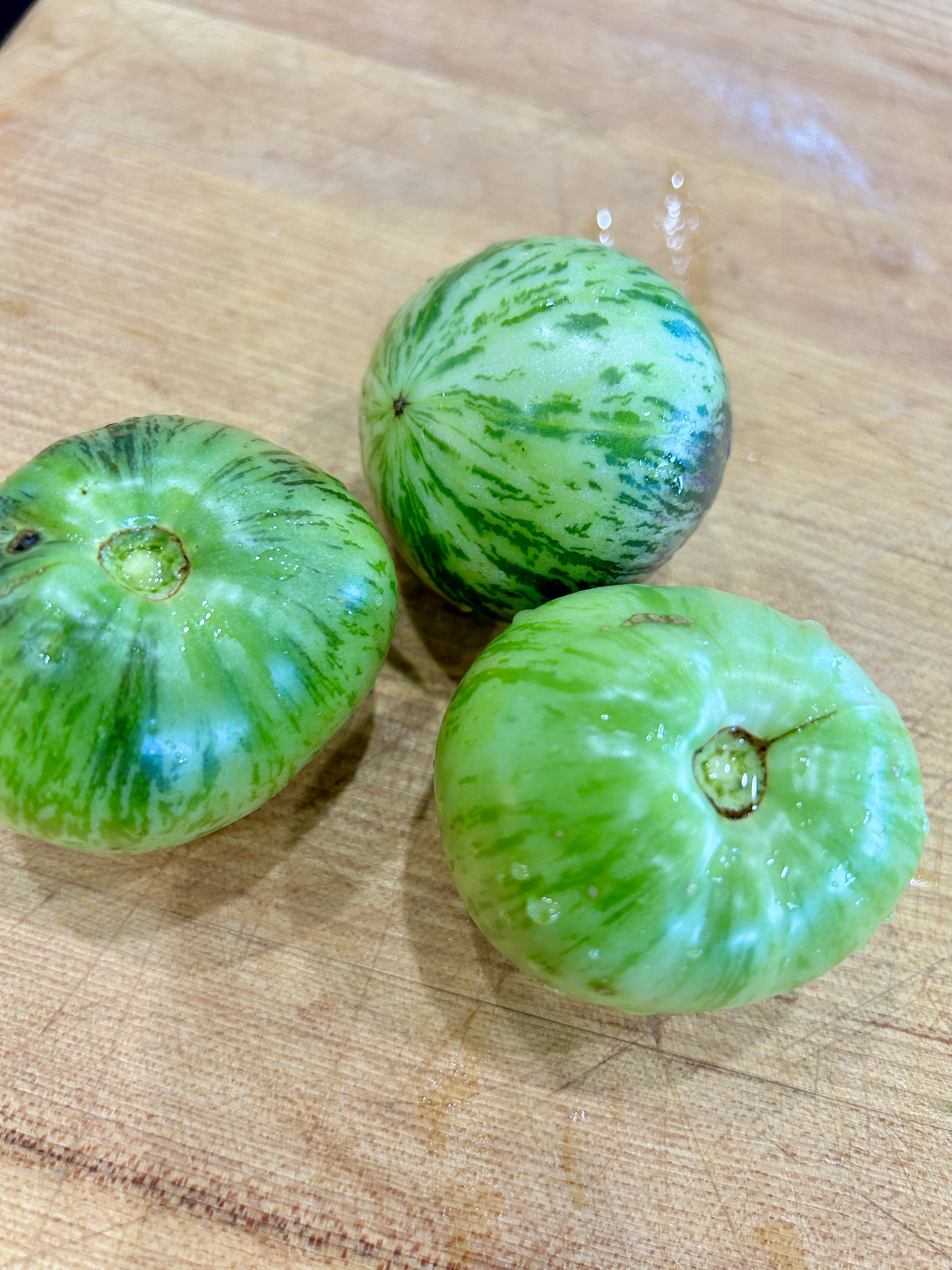 Pick fresh green tomatoes from the garden. Choose tomatoes that are round and unblemished. I'm using green Alice's Dream heirloom tomatoes here.