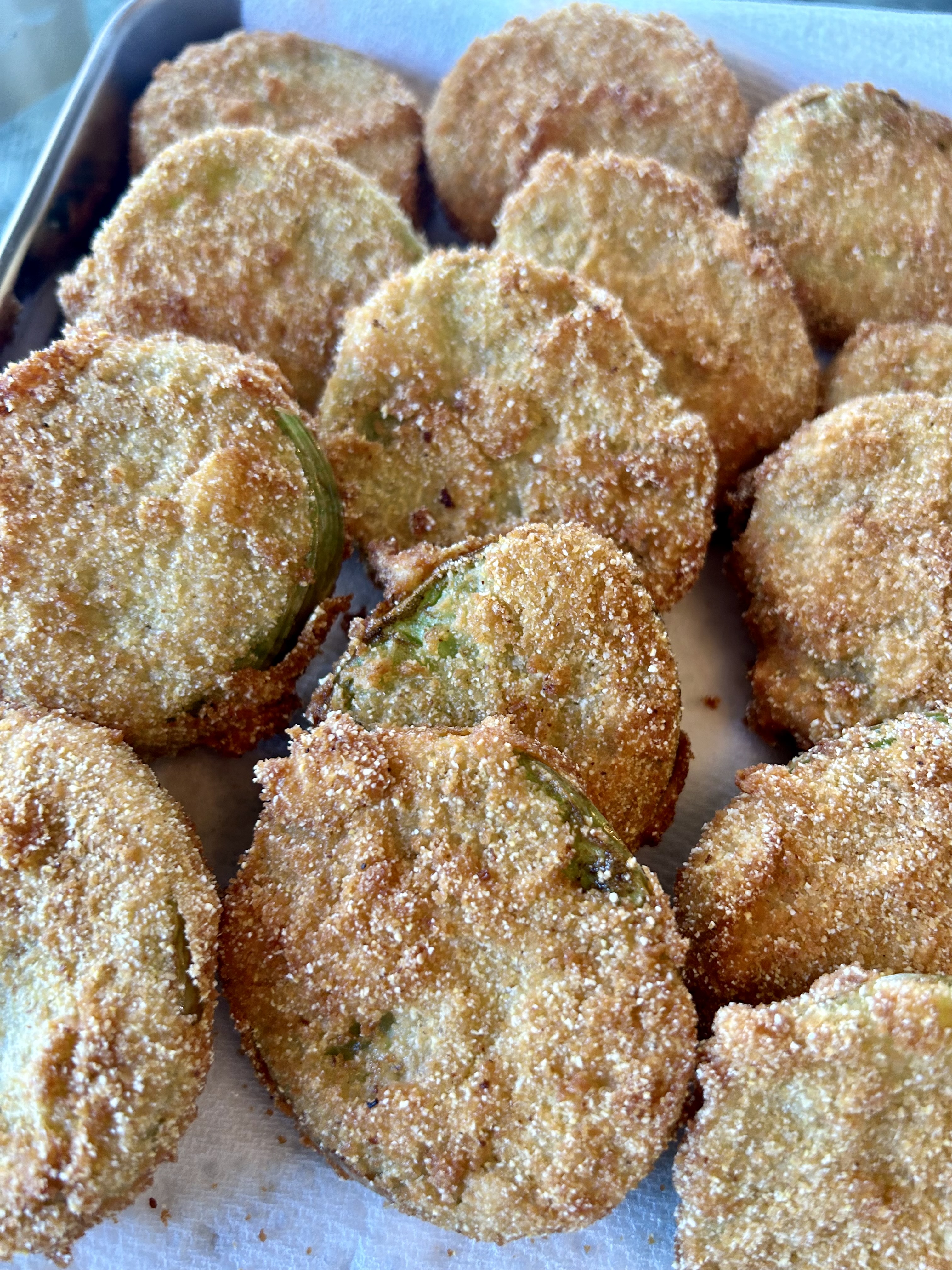 Battered and breaded cornmeal encrusted fried green tomato slices. A Southern favorite!