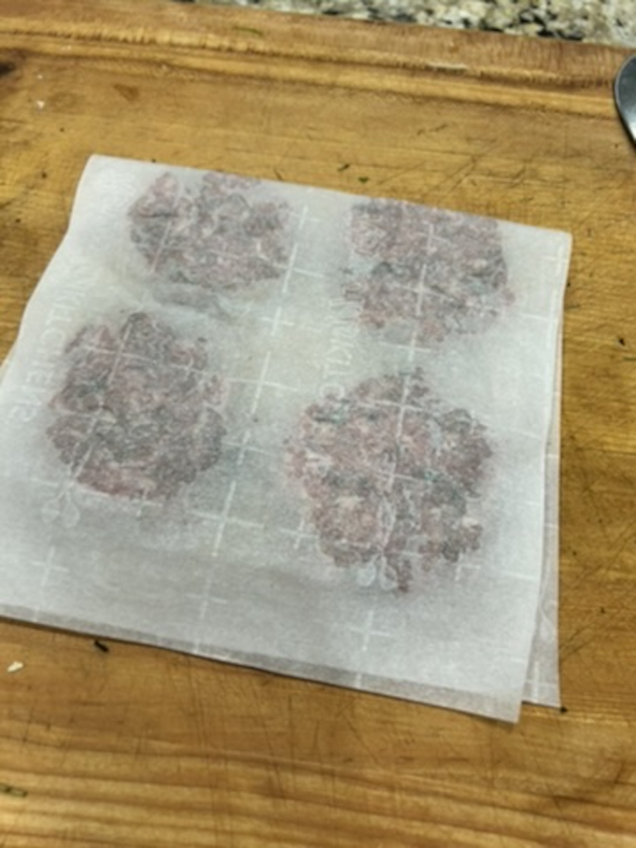 Add another piece of parchment paper on top, then press the meatballs down into patties.