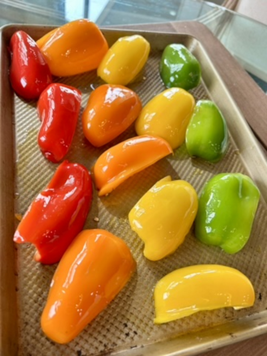 Pre-heat the oven to 450℉ Cut the peppers into quarters, and remove the stems and seeds. Lay the peppers out on a baking sheet in a single layer with space between each pepper. Brush the peppers with olive oil until evenly coated. Reserve the remaining oil.