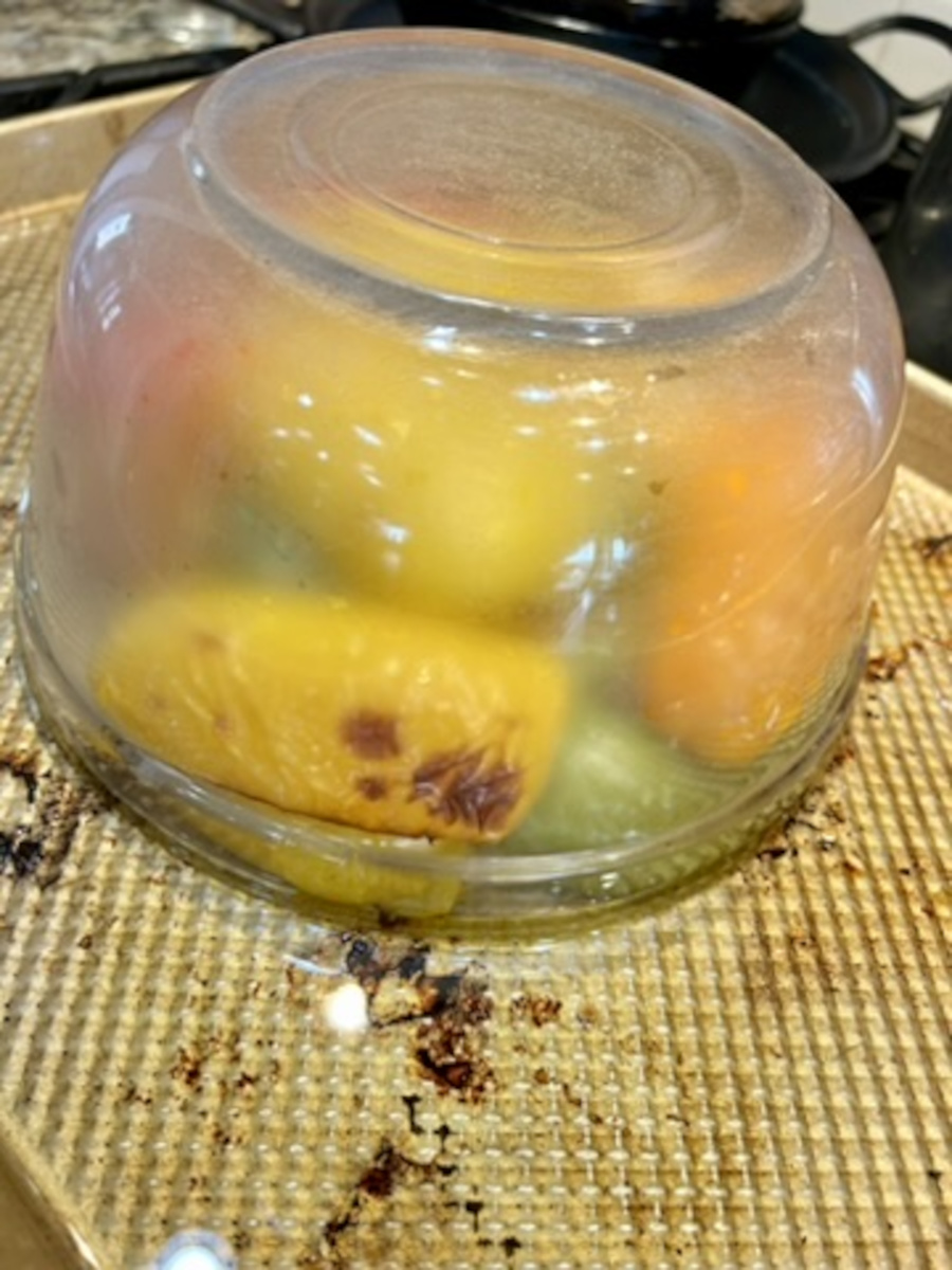 Place in a glass bowl with lid, or invert a glass bowl on top of the roasted peppers. Allow the peppers to steam out for about 15 minutes.