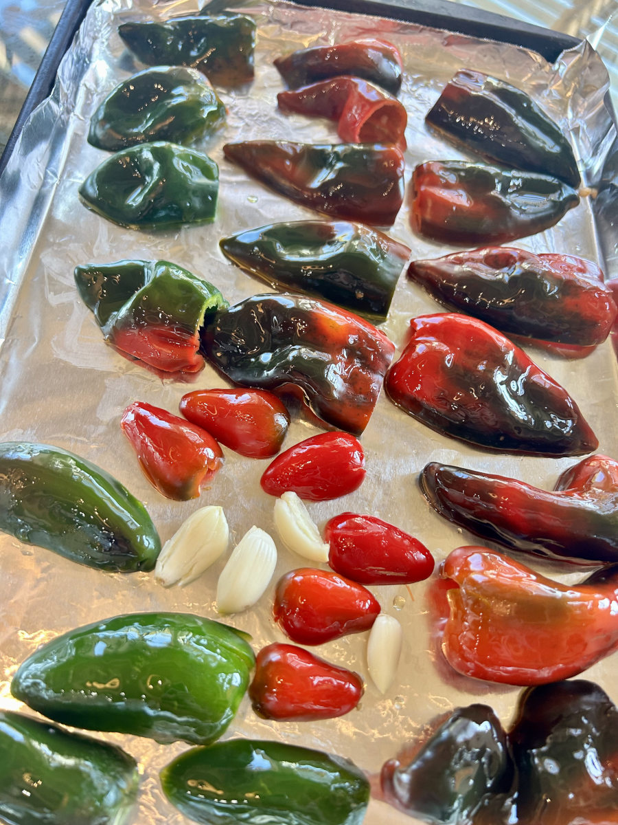 Remove the roasted peppers and garlic from the oven.