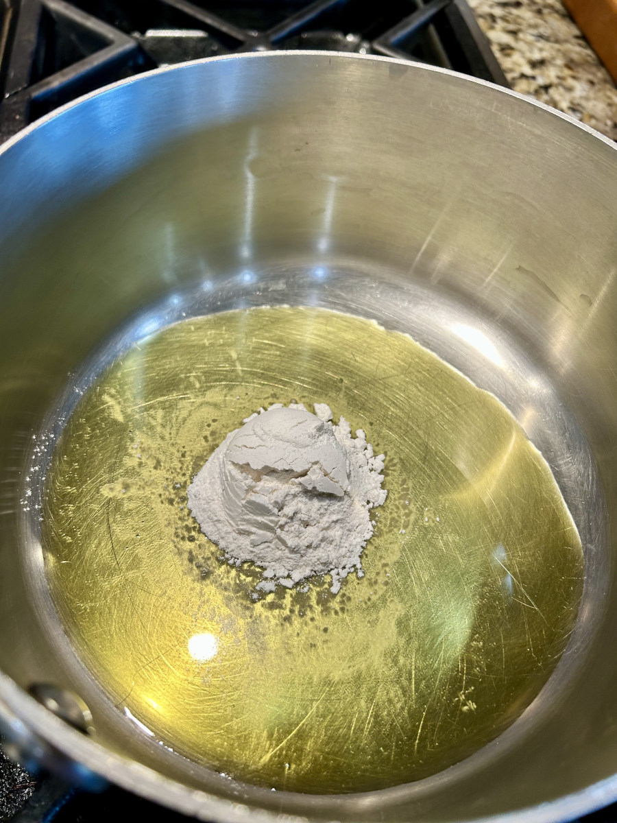 Meanwhile, add olive oil and flour to a stock pot over medium heat.