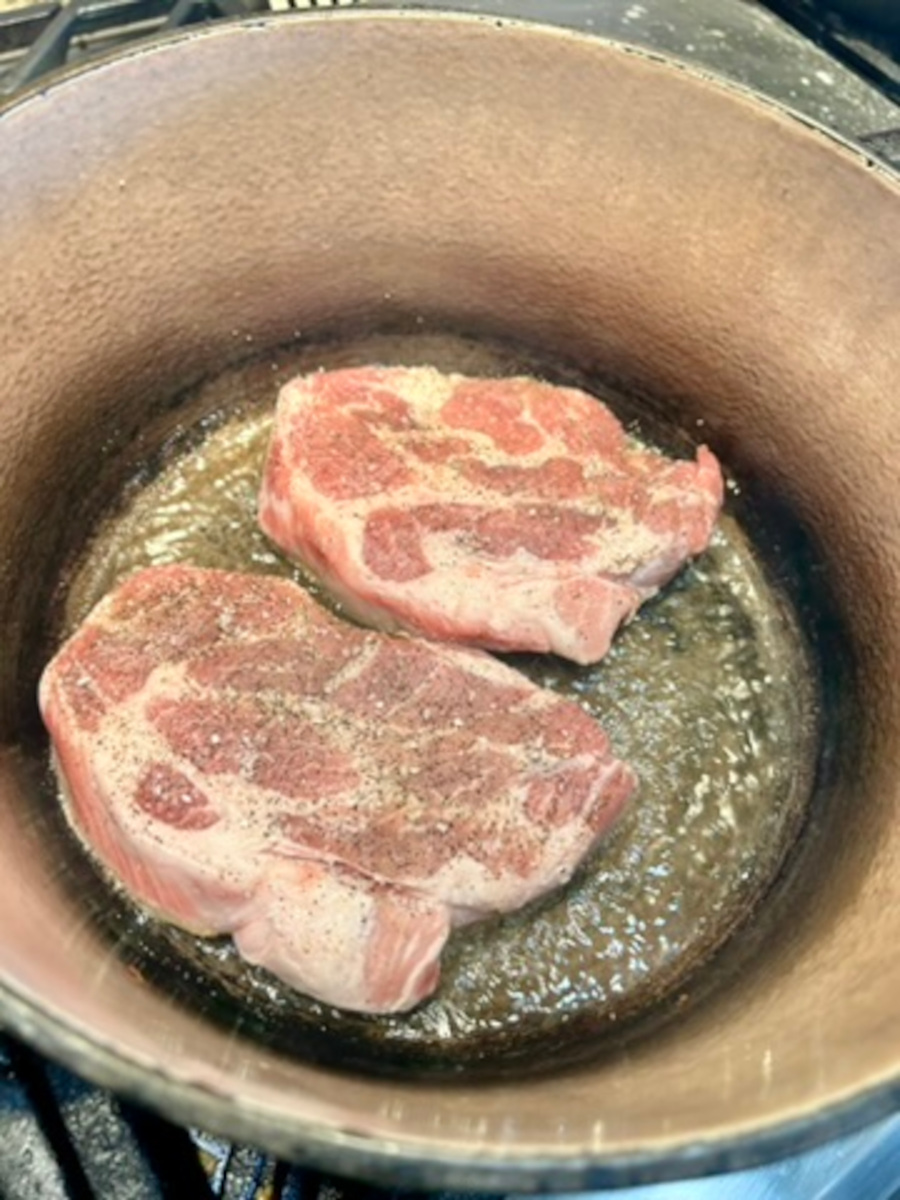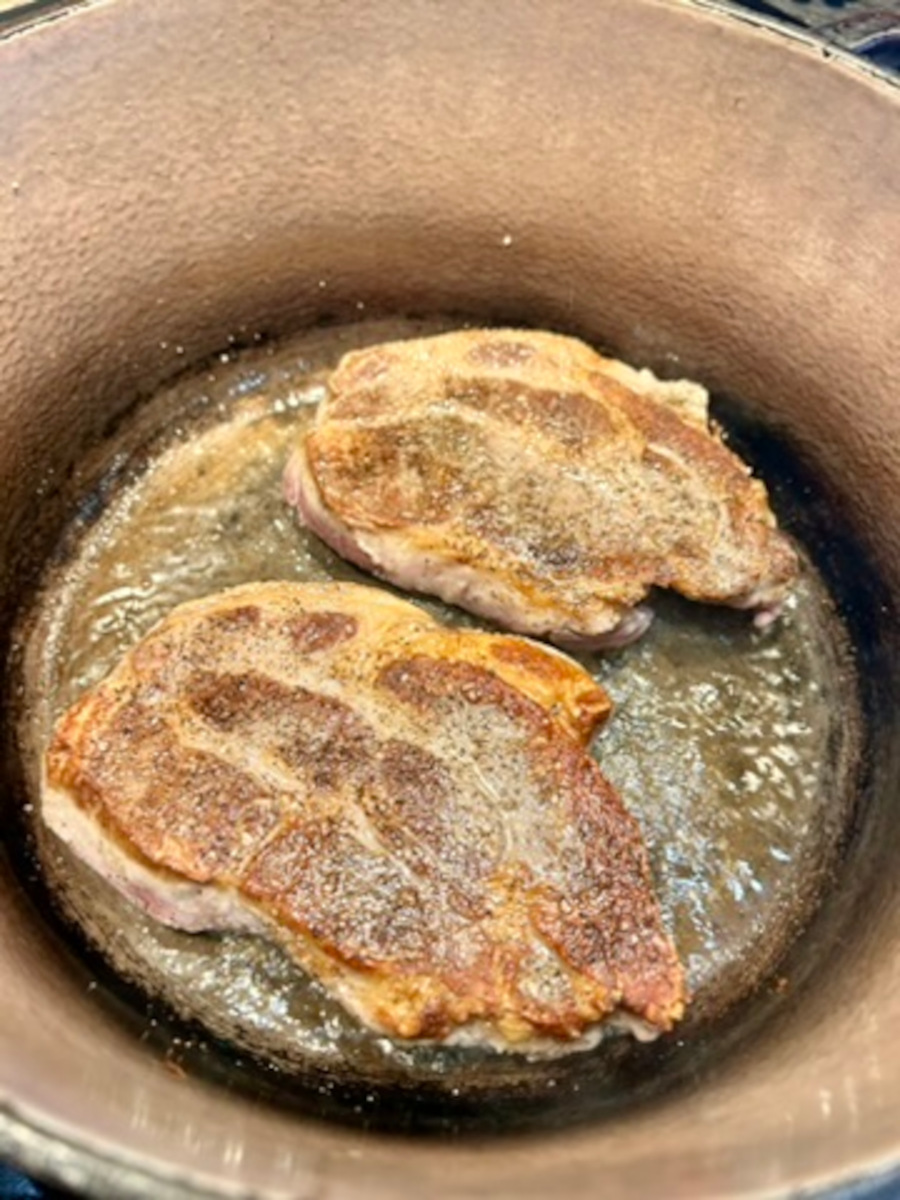 Add the coppa steaks to the hot tallow. Make sure to keep some space between each steak for proper browning.