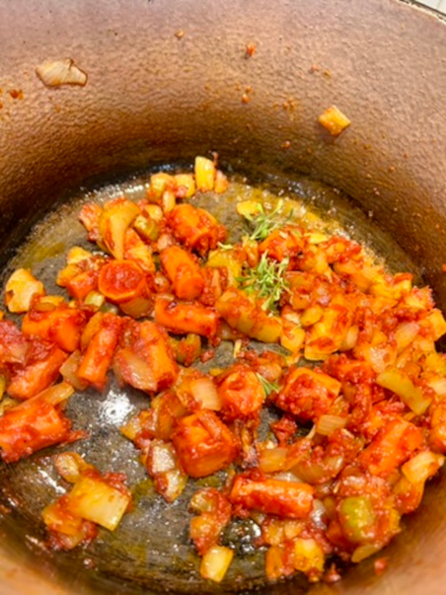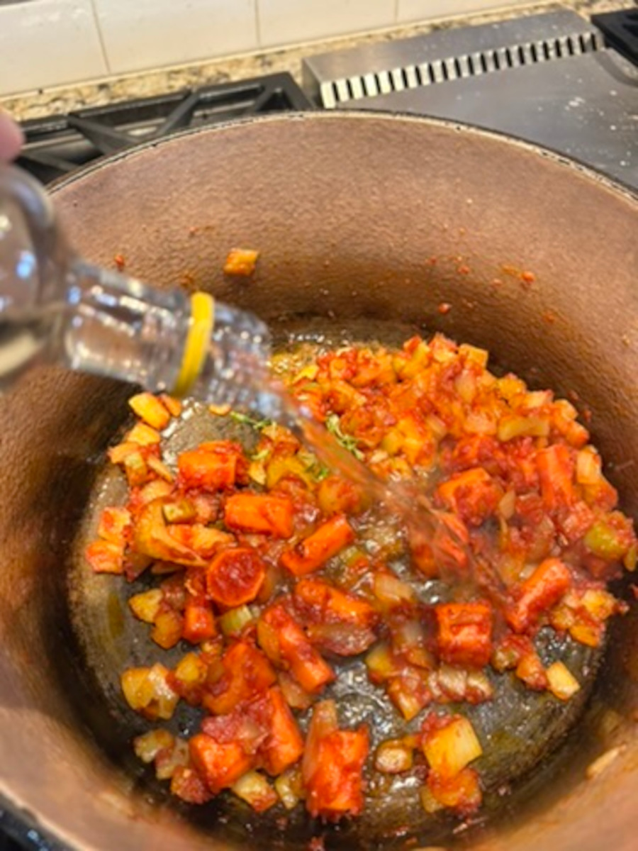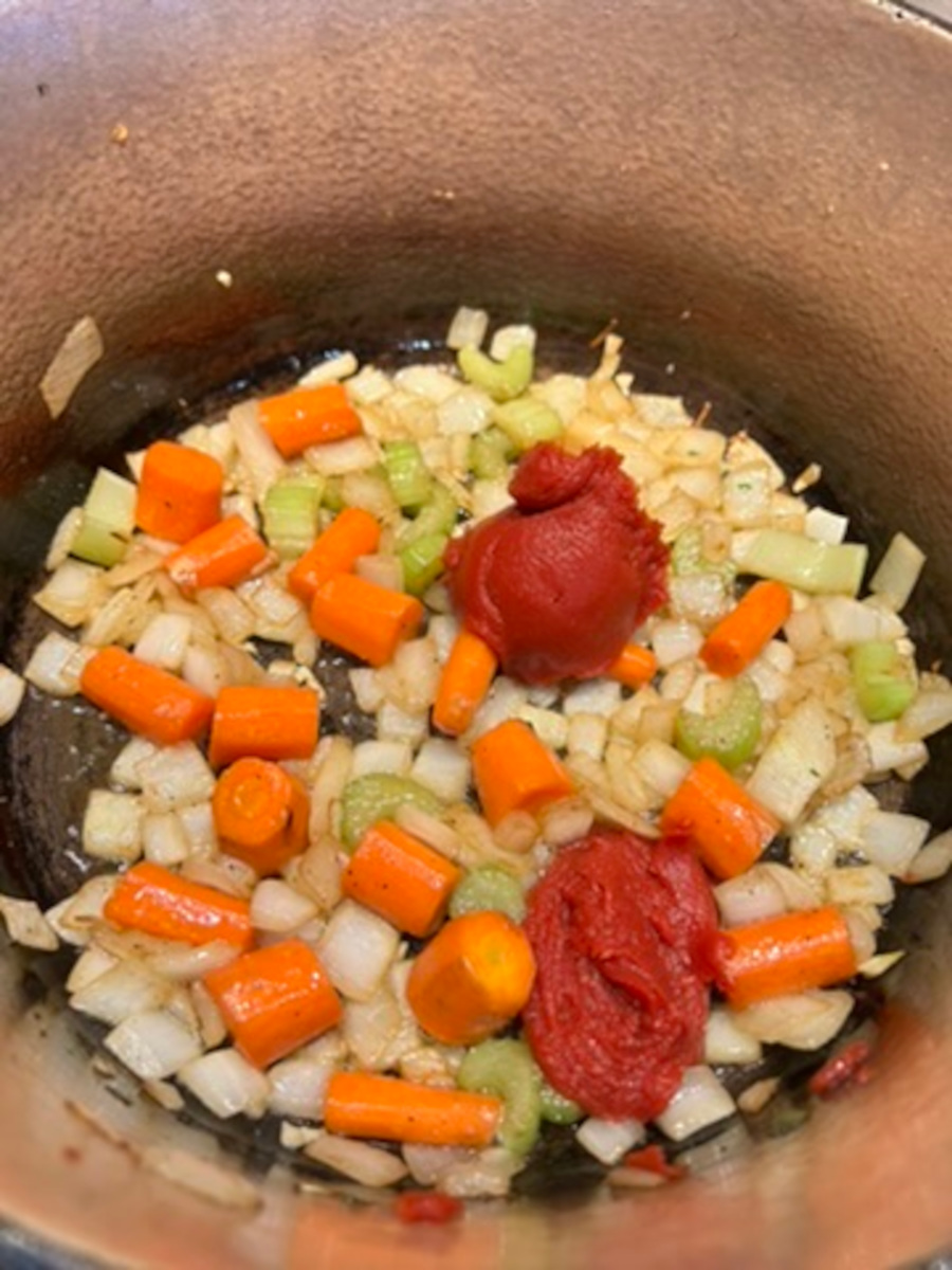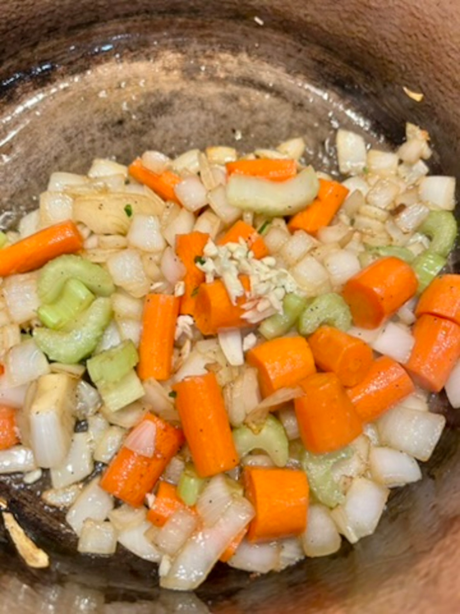 Add the onion, carrot, and celery (mirepoix) to the pot. Sauté until tender.