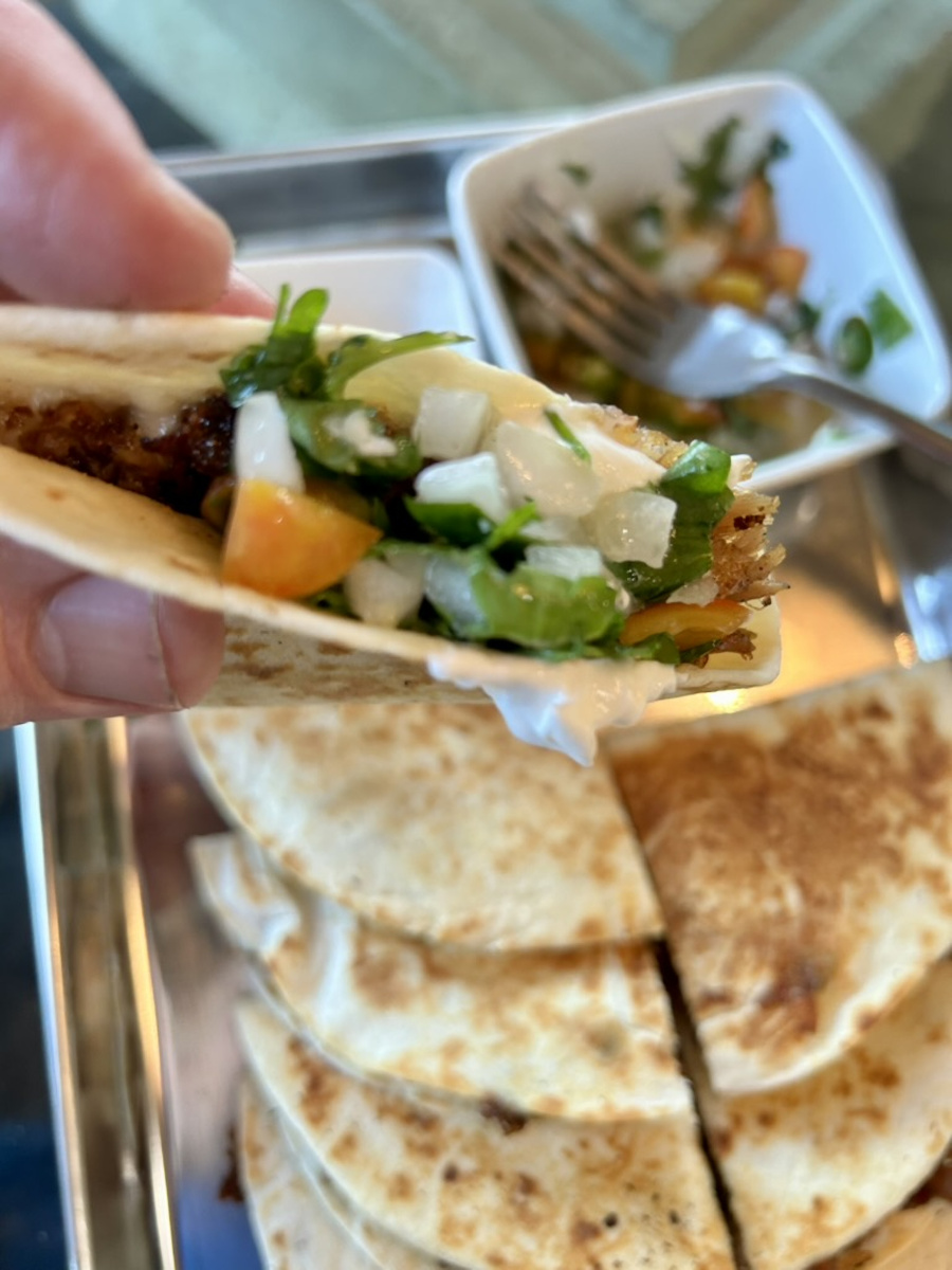 Place a flour tortilla onto the hot comal. Add ¼ cup of shredded mozzarella and ¼ cup pulled pork, then carefully fold over and press down with a spatula.