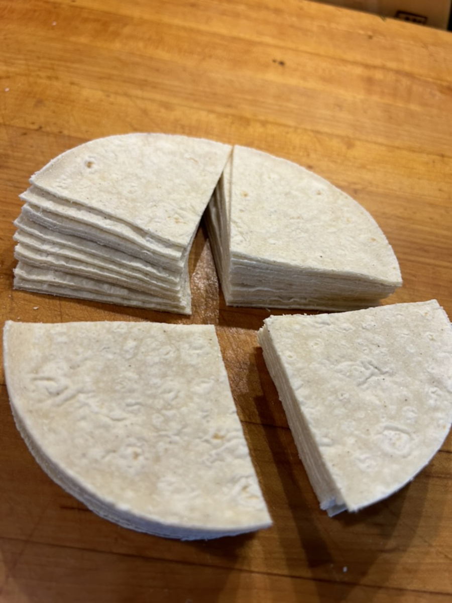 Cut a stack of 10 corn tortillas into quarters.
